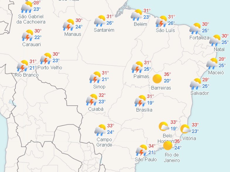 As chuvas intensas ainda vão atingir grandes partes do Norte, desde o Norte do Amapá, abrangendo o Amazonas, Pará, Maranhão e todo o estado de Tocantins. A área chuvosa engloba a região Centro-Oeste (Distrito Federal, Goiás), e desce até a região Sudoeste do país.