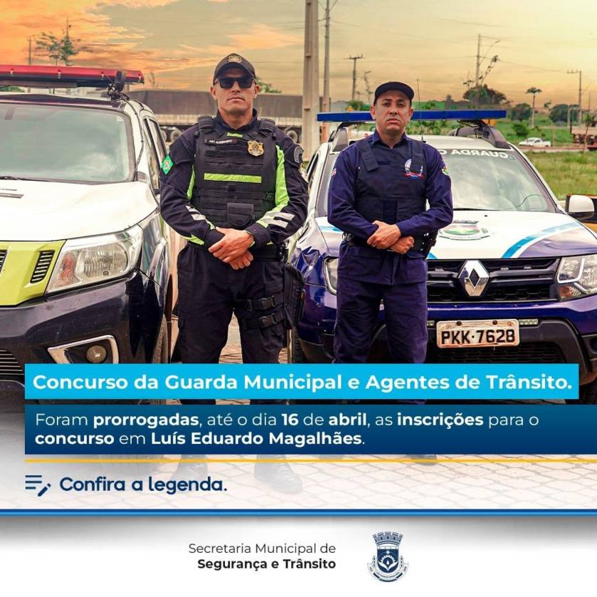 Foram prorrogadas até o dia 16 de abril, as inscrições para o concurso da Guarda Municipal e Agentes de Trânsito de Luís Eduardo Magalhães. Exclusivamente através do site: https://concursos.msconc.com.br/. O dia 17 de abril de 2023 é o último dia para o pagamento do boleto de inscrição, observado o horário bancário da Bahia.