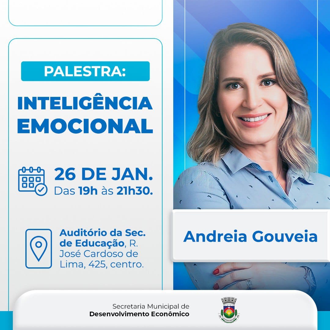 A Prefeitura de Luís Eduardo Magalhães, através da Secretaria Municipal de Desenvolvimento Econômico, promove no dia 26 de janeiro, às 19h, no auditório da Secretaria Municipal de Educação localizada na Rua José Cardoso de Lima, n° 425, Centro, a palestra gratuita sobre Inteligência Emocional com Andreia Gouveia.