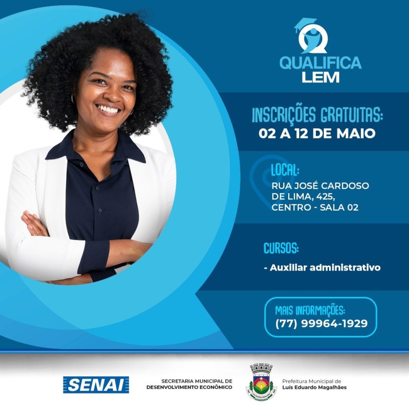 A Prefeitura de Luís Eduardo Magalhães, através da Secretaria de Desenvolvimento Econômico está com as inscrições abertas até o dia 12 de maio, para o Programa Qualifica LEM, desta vez para o curso gratuito de Auxiliar Administrativo.