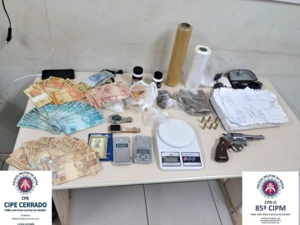 Com a mulher, que também era funcionária da fazenda onde aconteceu o furto de carnes, foram encontrados R$ 8.1 mil, um revólver calibre 38, munições de mesma numeração, três bolsas contendo grande quantidade de carne, porções de maconha, cocaína e crack, caderno com anotações sobre o tráfico de drogas e três balanças.