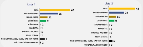 Foi a 1ª vez que o PoderData testou um 2º turno com Lula e Sergio Moro depois que o ex-juiz filiou-se ao Podemos e falou como pré-candidato. Neste cenário, 20% dos eleitores escolheriam votar nulo ou em branco e 1% deles não sabem.