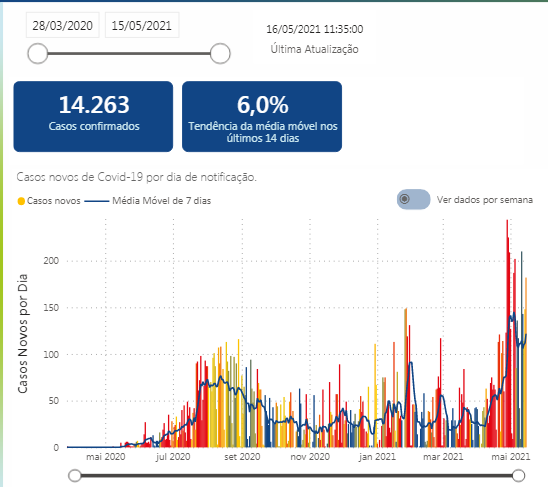 A média móvel de mortes diárias provocadas pela Covid-19 nesta terça-feira (18/5) foi de 1.930. O indicador sofreu uma pequena alta em comparação ao número registrado na segunda-feira (1.901). Em comparação com o verificado há 14 dias, houve queda de 16,6%, sinalizando uma desaceleração nos óbitos.