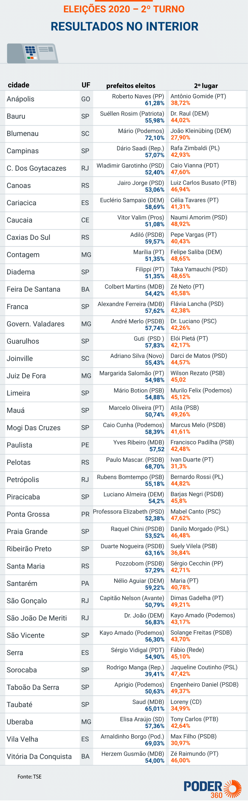 O Brasil tem 95 cidades com mais de 200 mil eleitores. Em 37 delas, os prefeitos foram eleitos no último dia 15 de novembro. Depois de domingo, apenas um município brasileiro ficará com a escolha do prefeito ainda pendente: Macapá (AP), com mais de 292 mil eleitores. Prejudicada por um apagão elétrico que se estendeu por 22 dias, a cidade terá o primeiro turno das eleições no dia 6 de dezembro. A segunda fase da disputa está marcada para o dia 20.