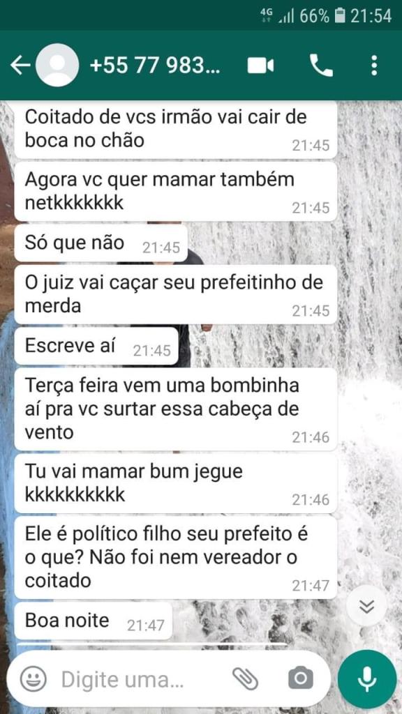 Em desespero total, o blogueirinho muito “macho” vinculado a gestão, envia mensagens revoltadas a alguns opositores, como no print acima, ameaçando que o “juiz eleitoral irá caçar”, com Ç, o “prefeitinho” eleito, visto que o atual prefeito Oziel Oliveira é um político profissional cheio de contatos, manobras e artimanhas.