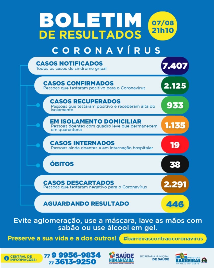 Até o momento, Luís Eduardo Magalhães tem 1.546 (mil, quinhentos e quarenta e seis) casos confirmados da doença, destes, 888 (oitocentos e oitenta e oito) recuperados, e 15 mortes no total.