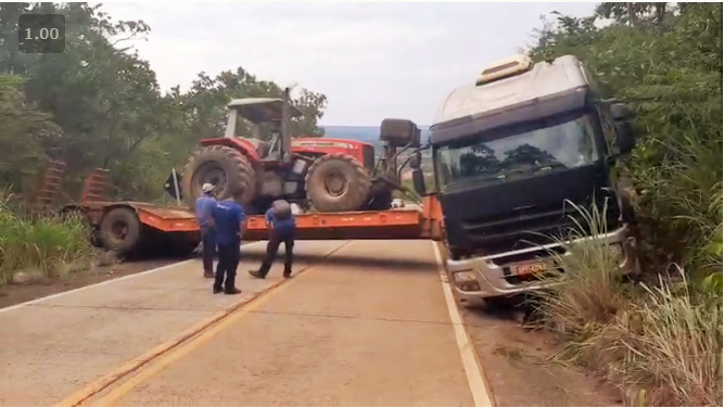 Uma carreta prancha, carregada com um grande trator de pneus, teve pane de motor ao subir o forte aclive da estrada que dá acesso ao Aeroporto de Barreiras. Ao “encepar”, como dizem os caminhoneiros, fez um L e obstruiu completamente a pista.