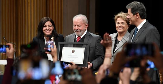 O ex-presidente Luiz Inácio Lula da Silva participou nesta segunda-feira (2) de cerimônia no Theatre du Gymnase em que recebeu o título de cidadão honorário de Paris em reconhecimento a sua luta e seu legado contra a fome e a miséria. Na cerimônia, ele criticou o ministro da Justiça, Sergio Moro, o presidente Jair Bolsonaro e os grandes meios de comunicação do Brasil.