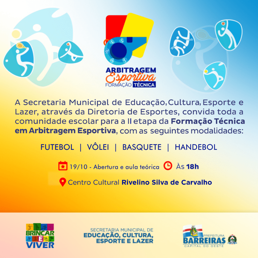 “Convidamos os profissionais de educação física, esportistas, recreadores e toda comunidade a participar dessa formação. É gratuito, temos 200 vagas e as inscrições estão abertas, dando oportunidade para a formação de árbitros e mesários que estarão aptos a atuar em jogos e eventos esportivos no município”, disse o diretor de Esportes, Fernando Machado.