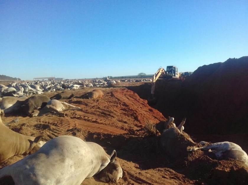 A Agência Estadual de Defesa Sanitária e Animal (Iagro), do Mato Grosso do Sul, confirmou a morte de mais de 1,1 mil cabeças de gado nesta segunda feira (7), no município de Água Clara, a 40 km da capital Campo Grande. Outra fonte informou à Gazeta do Povo que 1,6 mil animais teriam morrido.