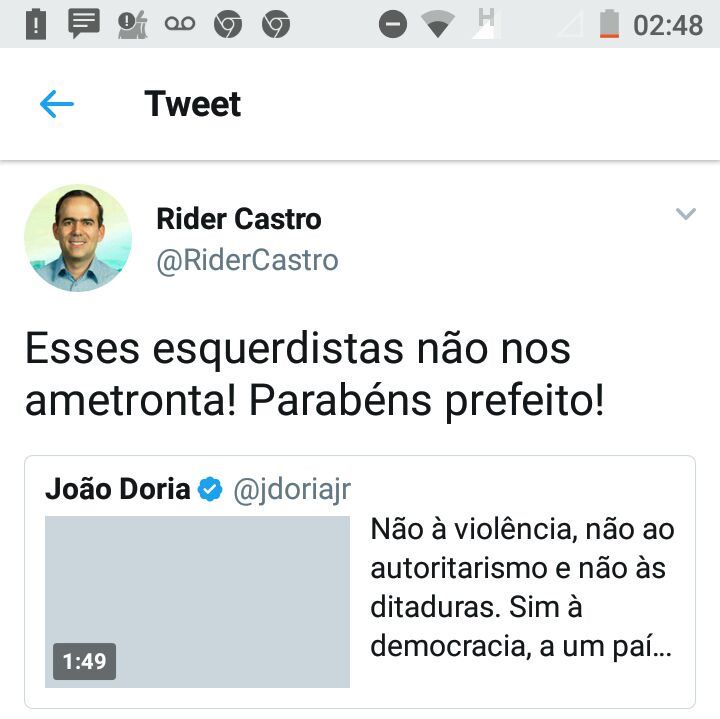 O empresário e líder classista Rider de Castro estava no plantão cívico ontem à noite. Quando João Dória Jr. protestou no twitter pela “violenta” agressão sofrida, Rider foi pronto em apoiá-lo, com uma frase emblemática.