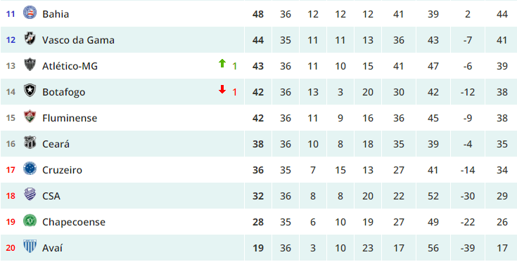 Por seu turno, faltando duas rodadas para o final do Campeonato, o Bahia perdeu para o Atlético Paranaense e ficou a 4 pontos do 16º colocado, o Vitória. Suas chances de não cair para a segunda divisão agora são muitas.