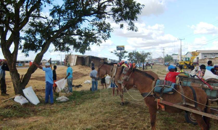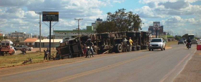 Um bitrem carregado com cerca de 40 toneladas de soja tombou, depois de perder um eixo da primeira carreta, na BR-242, próximo ao posto Ursa. O veículo, placas GPZ 9544, de Campo Mourão, Paraná, era conduzido por Carlos Eduardo Neumann. Mais de três dezenas de pessoas acorreram ao local para aproveitar as sobras da soja que derramou na faixa de domínio. Populares em carroças, bicicletas e até pequenos caminhões aguardavam a liberação da PM para varrer a soja.