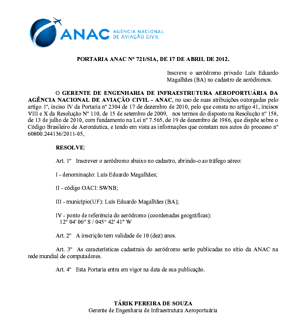 O principal objetivo do aeroporto é a exportação de frutas, através de avião cargueiro com conexão direta com o Aeroporto de Recife. No futuro, espera-se o estabelecimento de linhas domésticas, já que 75% da demanda de passageiros do aeroporto de Barreiras tem origem em Luís Eduardo Magalhães. Veja aqui e aqui parte da história da construção do novo aeroporto. Acima, fac simile da portaria da ANAC. Clique na imagem para ampliar.