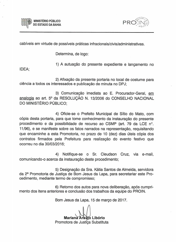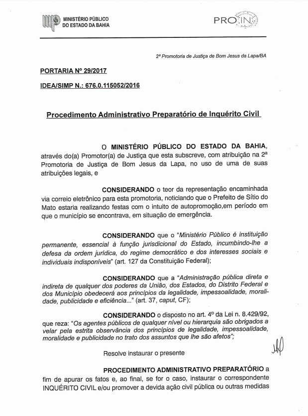 O Ministério Público da Bahia abriu procedimento preparatório de inquérito civil, através da 2ª Promotoria de Bom Jesus da Lapa, contra o prefeito Alfredinho, de Sítio do Mato, por realizar festas públicas, em clara autopromoção pessoal, durante período em que o Município estava em estado de emergência.
