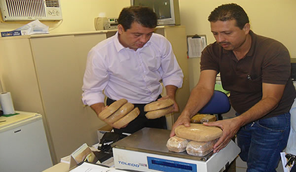 O delegado Rivaldo Luz pesa a cocaína apreendida, com o auxílio de um investigador. Foto de Sigi Vilares