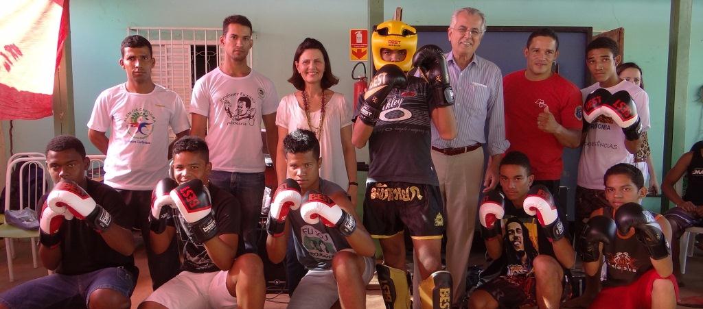 Os alunos do Projovem do Centro de Referência em Assistência Social (CRAS) de Luís Eduardo Magalhães receberam na tarde desta quarta-feira, 26 de fevereiro, 30 kits contendo luvas e protetores de canelas. A iniciativa faz parte de uma ação da Secretaria de Trabalho e Assistência Social em oferecer oficinas de Muay Thai para os alunos, iniciada no segundo semestre de 2013. Participaram da entrega o prefeito Humberto Santa Cruz, a secretária de Trabalho e Assistência Social, Maira de Andrada Santa Cruz e o professor e mestre de Muay Thai, Douglas Dias.