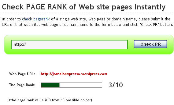 O site americano Google PRChecker presta um serviço gratuito ao internauta avaliando o grau de relevância de páginas da internet, com base em número de acessos, qualificação dos leitores e universalidade das informações e dos assuntos veiculados. Pois o blog do Jornal O Expresso acaba de ser ranqueado como 3/10 no site. Regionalmente, só o site do Novoeste alcança 3/10. O Jornal Nova Fronteira alcança 2/10 e os outros sites, blogs e portais estão ainda no zero. Para se ter idéia, o Bahia Notícias e o Política Livre estão com ranking de 4/10. E blogueiros de renome nacional, como Cláudio Humberto e Paulo Henrique Amorim estão com 5/10. O site da BBC, o mais acessado do mundo, está com 9/10.