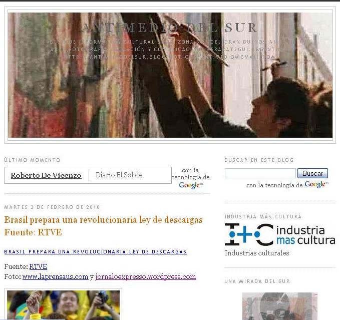 Um blog argentino, Antimedio del Sur, faz uma longa análise sobre a nova lei dos meios de comunicação brasileiros, inclusa aí a internet, citando como fonte o blog do Jornal O Expresso e outras fontes. Clique no link para ver a matéria completa do blog, que analisa cultura e meios de comunicação na região ao sul de Buenos Aires, mais precisamente na cidade de Berazategui. A Região oeste está indo muito longe, bem além do rio São Francisco. Trecho do artigo: