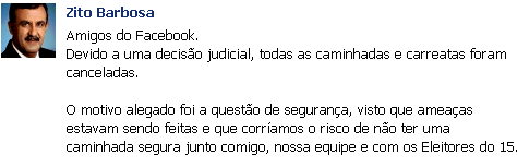 O Juiz Eleitoral de Barreiras proibiu qualquer tipo de manifestação política para o dia de hoje, último da campanha, inclusive caminhadas e carreatas já programadas, tendo em vista a sequência de incidentes ocorridos ontem. O candidato Zito Barbosa mandou publicar nas mídias sociais o cancelamento das manifestações.