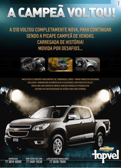 O modelo, que está sendo lançado pela Chevrolet este mês, foi desenvolvido pelo Centro Tecnológico da GM do Brasil e será comercializado em mais de 40 países na Europa, África, Oriente Médio e América do Sul. Em Luís Eduardo Magalhães, a Topvel prepara uma grande festa para a chegada do novo modelo.