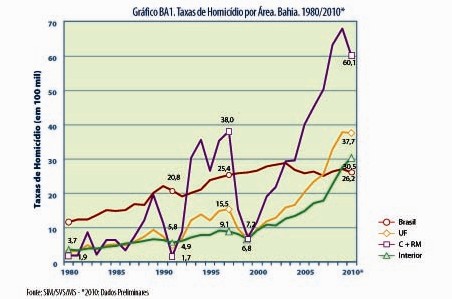 De acordo com o estudo, realizado pelo Centro Brasileiro de Estudos Latino-Americanos e pela Faculdade Latino-Americana de Ciências Sociais, divulgado esse mês, entre as capitais, Maceió (AL) ocupa a 1ª posição (94,5 mortes por 100 mil habitantes), João Pessoa (PB) a segunda e Salvador (BA) ficou com a 4ª posição.