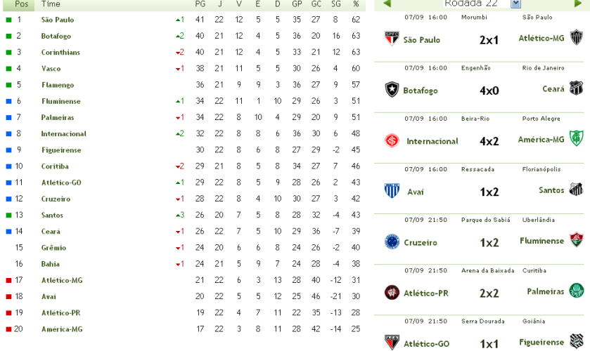 A 22ª Rodada do Brasileirão consagrou um novo líder, o São Paulo, ao menos até a noite de hoje, quando o Corinthians enfrenta o Flamengo. O Internacional empurrou o América para o fundo da lanterna e vingou, por 4×2, os quatro gols que o Vasco levou em Sete Lagoas. Firme mesmo está o time do Botafogo, que pegou o Ceará, no Rio, e mandou ver: 4×0.