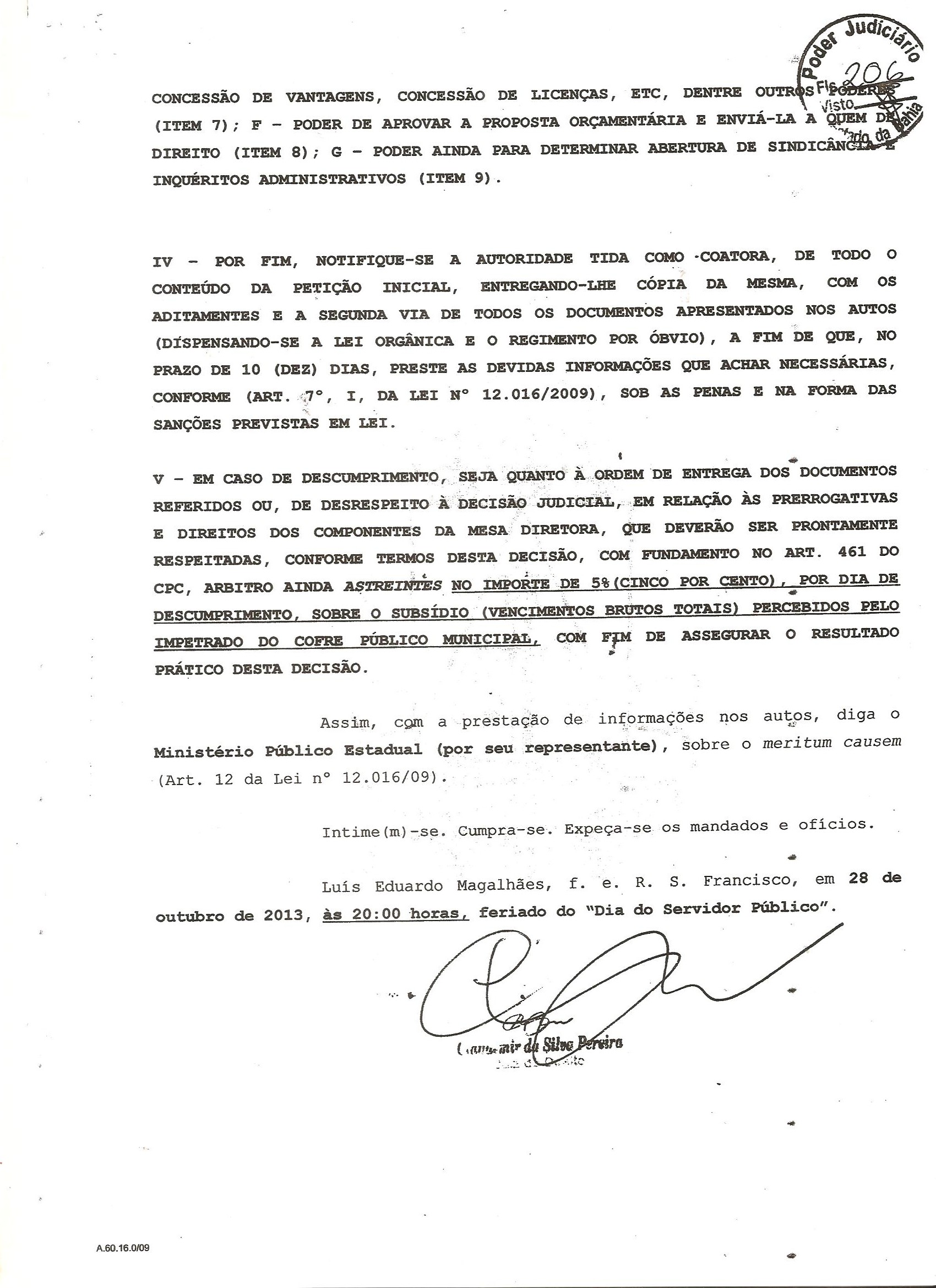 Tomamos conhecimento da íntegra da decisão do juiz Claudemir da Silva Pereira, da Comarca de Luís Eduardo Magalhães, acolhendo o mandado de segurança dos membros da Mesa Diretora da Câmara Municipal, em que pedem a liberação de documentos públicos retidos pela Presidência da Casa Legislativa. A decisão foi assinada pelo Magistrado nesta segunda-feira, 28. Ele determina a citação do presidente Domingos Carlos Alves e a juntada dos documentos solicitados no prazo de 10 dias, a contar da data do cumprimento do ato pelo oficial de justiça. Se o prazo não for cumprido, o Juiz determina, de antemão, a busca e a apreensão dos documentos, com o auxílio de força policial, se necessário for. O bom resultado da demanda se deve à determinação dos vereadores impetrantes, bem como ao trabalho esclarecedor e embasado nos melhores parâmetros jurídicos do advogado da parte. Veja abaixo, na imagem, parte da decisão do Juiz, nas suas duas páginas finais: