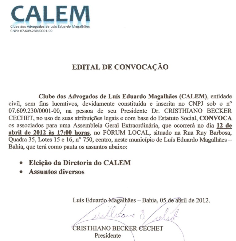 O CLUBE DOS ADVOGADOS DE LUÍS EDUARDO MAGALHÃES (CALEM), vem, por meio deste, respeitosamente, a presença de Vossa Excelência, expor e requerer o quanto segue: