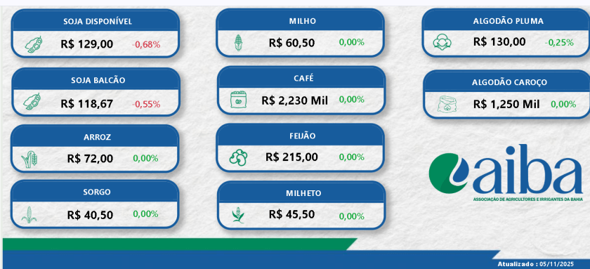 No Oeste baiano, soja teve leve queda e milho andou de lado, com pequeno crescimento da pluma de algodão.