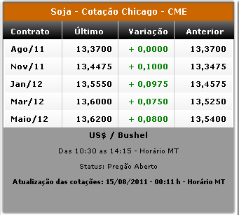 Nesta segunda-feira, no primeiro pregão noturno de 2011, os preços da oleaginosa encerraram com leve alta na Bolsa de Chicago. Dentre os principais vencimentos, apenas o de janeiro não ficou acima dos US$14 por bushel.