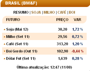 A cotação da soja teve dia de forte oscilação em Chicago, com as duas pontas puxando os preços, segundo os analistas do portal Notícias Agrícolas. De um lado, o medo de quebradeira na Europa; de outro, China, com seca, comprando mais. Produtor deve esperar para vender. Em Luís Eduardo, os preços oscilam entre 28,50 reais e 30,50 reais a saca de 60 kgs. Haja armazém para quem começa a colher e não tem compromissos financeiros urgentes!