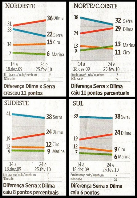 Normalmente os blogs Amigos do Presidente Lula e Amigos da Presidente Dilma são radicais ao defender o Presidente e a pré-candidata. Mas fazem uma análise bem coerente ao divulgar material da Folha de São Paulo, com entrevista com o diretor do Datafolha, Mário Paulino. As ilustrações mostram como a preferência por Dilma Rousseff cresceu em várias regiões. Fica evidente, no entanto, que os blogs bombardeiam também Aécio Neves, pois o PT tem medo da candidatura do “bom moço”, ainda mais se associado a Ciro Gomes, caso Serra venha a desistir. Segundo o blog do Noblat, “o crescimento da pré-candidata petista, Dilma Rousseff, na última pesquisa Datafolha sobre a sucessão presidencial fez a oposição entrar em estado de alerta. Isso porque a redução da vantagem do governador paulista José Serra (PSDB) em relação a Dilma, de 14 para quatro pontos percentuais, foi maior do que se esperava. Os tucanos temem que isso reforce as especulações de que Serra poderia trocar a acirrada disputa nacional por uma reeleição mais tranquila em São Paulo”.