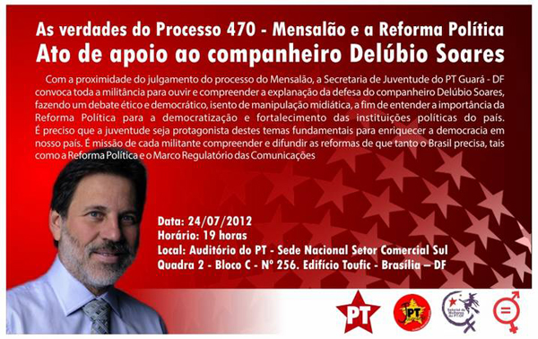 O diretório zonal do PT na Vila Mariana, bairro de classe média em São Paulo, foi o palco escolhido por Delúbio Soares, ex-tesoureiro do partido, para sua última manifestação pública, antes do julgamento da Ação Penal 470, que começa na próxima quinta-feira, 2 de agosto.
