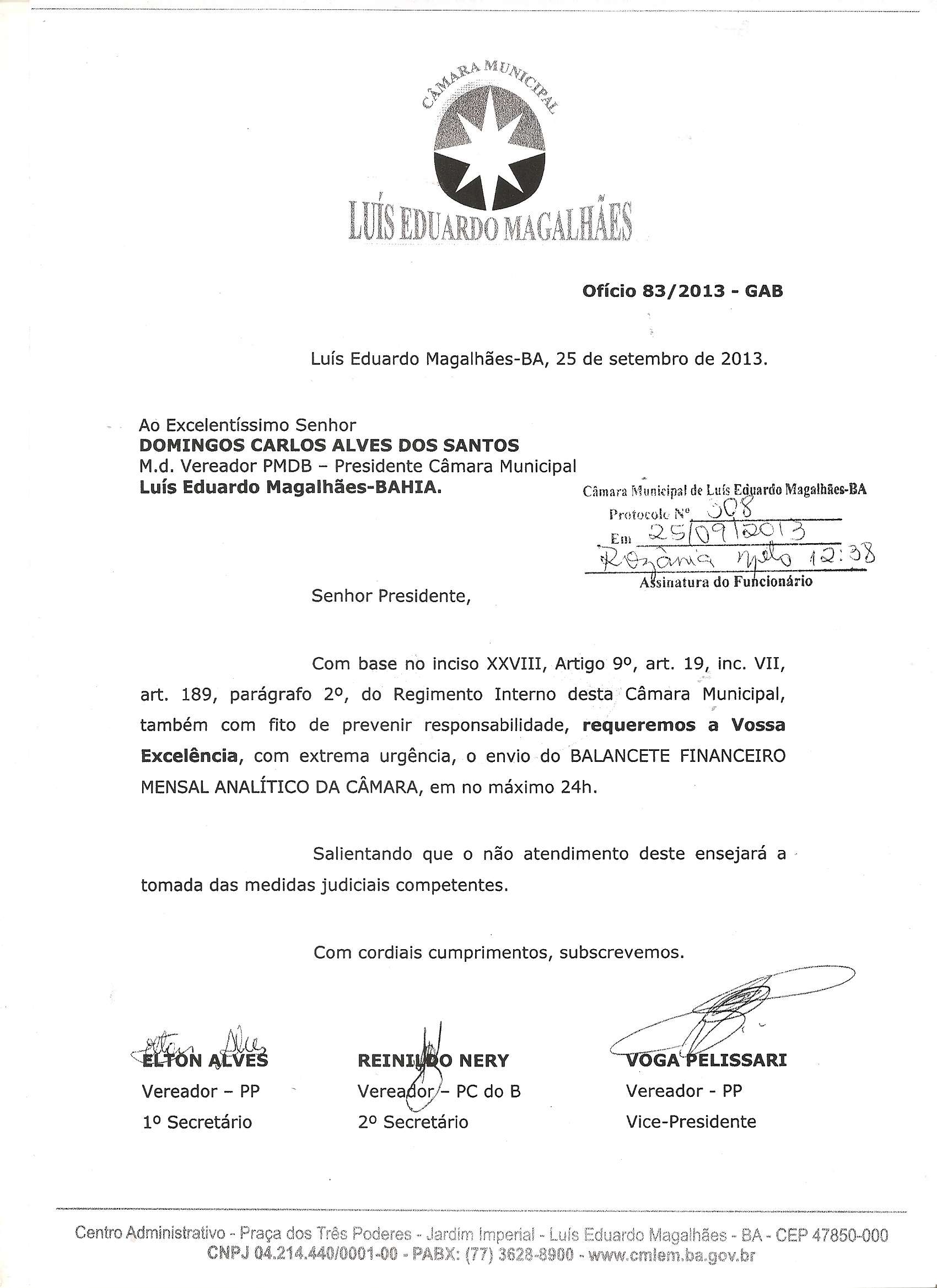 O Vereador deu assim mais uma prova cabal de seu alto espírito público e democrático, zelando pela sua honra e pela preservação da imagem do Legislativo, em detrimento da liberdade de imprensa e de informação prevista na Carta Magna da Nação.