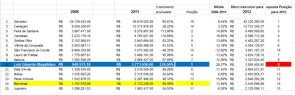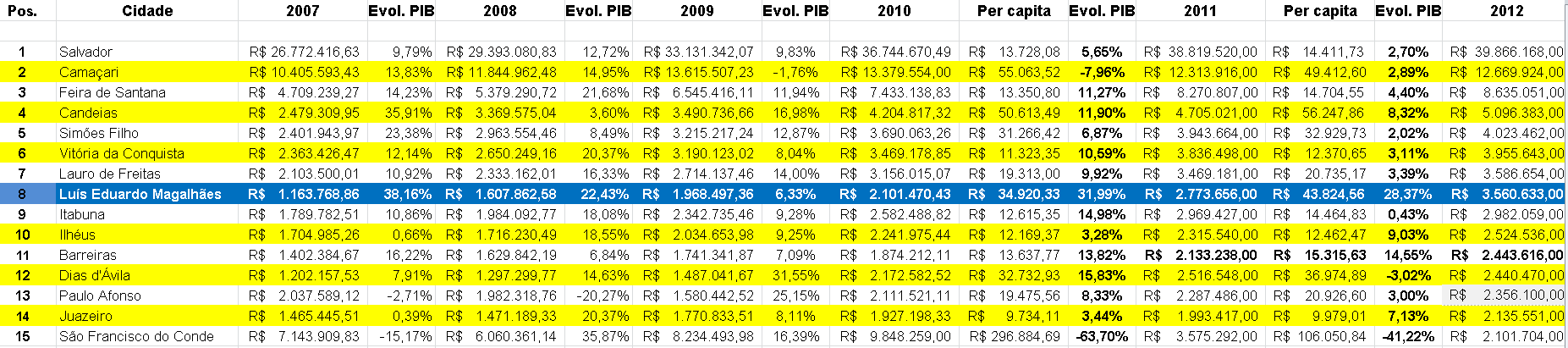Outro dado interessante, somando o aumento dos outros dois maiores PIB´s da Bahia, Camaçari ( R$ 356.008.000,00) e Feira de Santana (R$ 364.244.000,00 ), que totalizam R$ 720.252.000,00 , LEM ainda obteve um acréscimo de 9,26% a mais que a soma dos dois municípios.