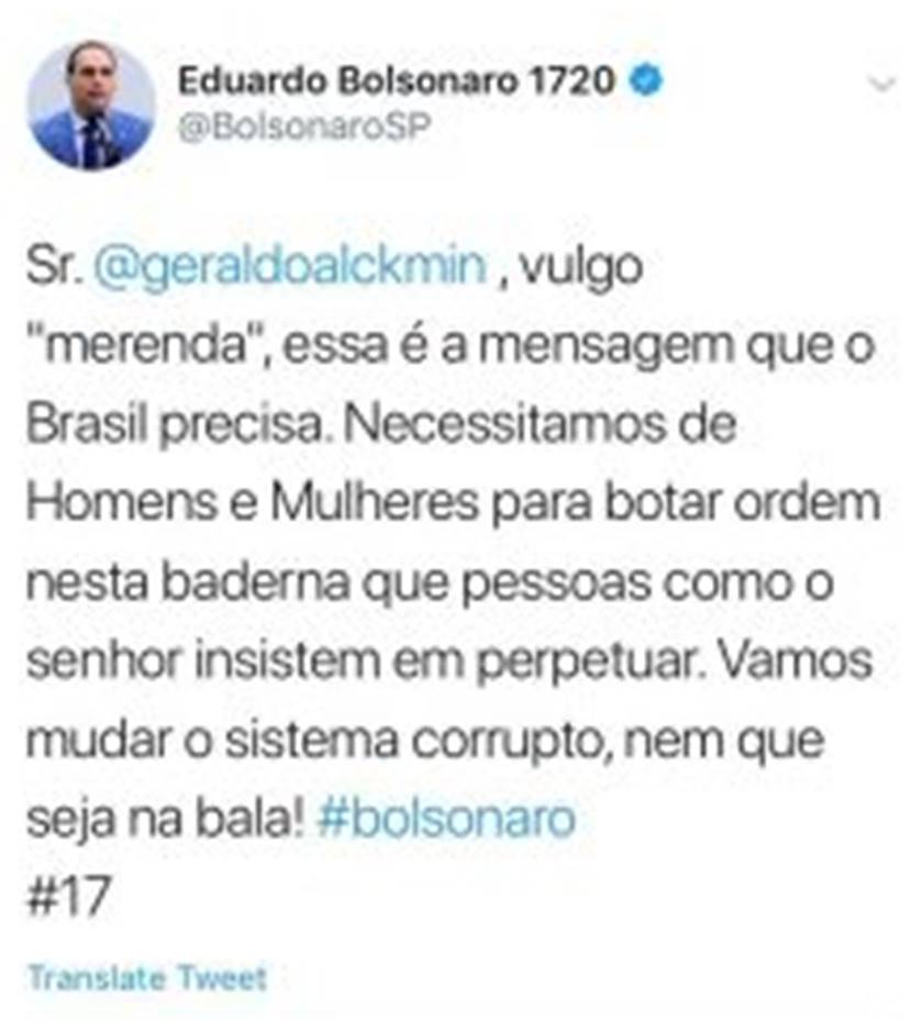 “Posso discordar veemente das palavras ditas por Eduardo Bolsonaro, mas entendo que esse Conselho de Ética não tem o condão de atuar como o verdadeiro censor das palavras ditas no Brasil ou no exterior”, disse Feitas que alegou inépcia formal da denúncia.