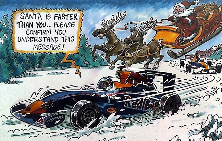 No cartão, os dois pilotos da equipe estão simulando uma corrida na neve quando Vettel recebe a mensagem no rádio: “Papai Noel está mais rápido que você…Por favor, confirme que você entende essa mensagem!”.