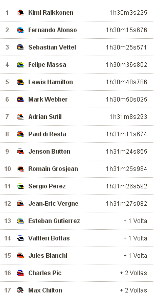A equipe, em erro estratégico sem justificativas, deixou-o rodando com os pneus em tiras, perdendo 2 ou três segundos por volta. Quando voltou a pista, Massa estava em quarto lugar, posição que permaneceu até o final da corrida. Alonso herdou o segundo lugar e fez a festa no pódio. Kimi Raikkonen, o homem de gelo, com uma troca a menos de pneus colocou a Lotus preto e dourada na ponta e surpreendeu. De resto, a prova cheia de alternativas, valeu a madrugada insone. Veja o resultado final da prova: