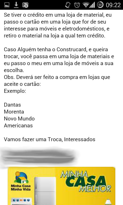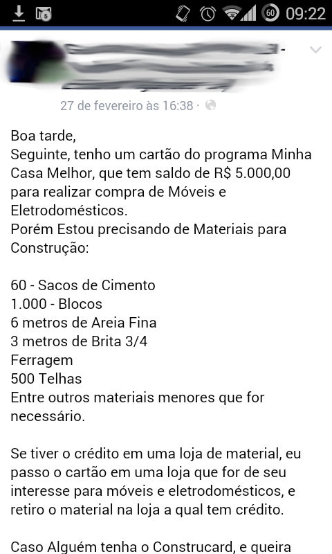 Um jovem e esperto empresário anda comprando cartões do Minha Casa Melhor, programa do Governo Federal, em Luís Eduardo Magalhães, certamente com um grande deságio. E não teve receio de publicar a prova da fraude em grupo de mídias sociais. Como ele mesmo diz na sua mensagem, troca por material de construção. É a prova necessária para ser processado: só é beneficiado com o cartão do Programa quem já tem a sua casa. Portanto o cartão não é dele. Temos o print da tela original, sem o sombreamento da identificação, caso a Justiça precise de prova da fraude.