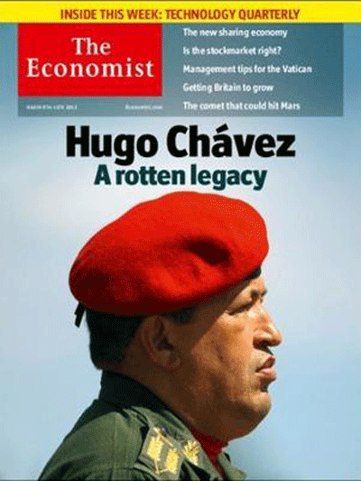 A revista britânica ainda defende que, por trás da propaganda, “a feia realidade da Venezuela é de um regime corrupto, cínico e incompetente”. E afirma ser “lamentável” que Chávez não estará vivo para “colher as tempestades do que semeou”. Do Portal da Imprensa.