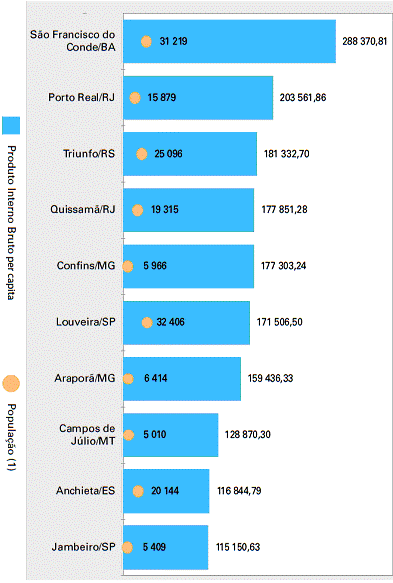No ano do encerramento da estatística do IBGE sobre o PIB das cidades, 2008, os dez municípios de maiores PIB per capita possuíam baixa densidade demográfica. São Francisco do Conde (BA) abrigava a segunda maior refinaria em capacidade instalada de refino do País. Em Porto Real (RJ) havia uma indústria automobilística. Triunfo (RS), na Região Metropolitana de Porto Alegre, era sede de um polo petroquímico importante. Quissamã (RJ), tinha como atividade principal a extração de petróleo e gás natural. Confins (MG) ganhou posição desde 2005 quando seu aeroporto internacional recebeu a maior parte dos vôos destinados a Belo Horizonte. Louveira (SP) concentrava centros de distribuição de grandes empresas.
