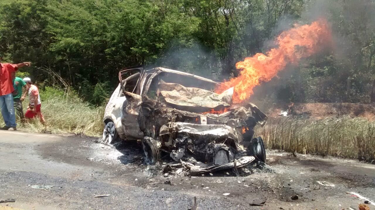 Por volta de 6 e 30 da manhã uma caçamba de transporte de carne bateu em um caminhão carregado de aguardente, que pegou fogo com a colisão. Duas pessoas que estavam no caminhão morreram carbonizadas, presas às ferragens. O motorista do outro veículo ficou ferido.