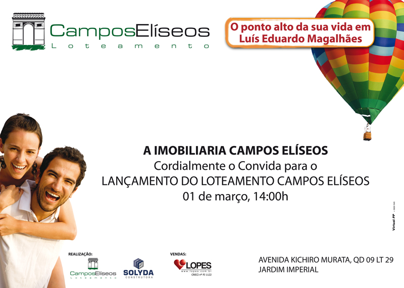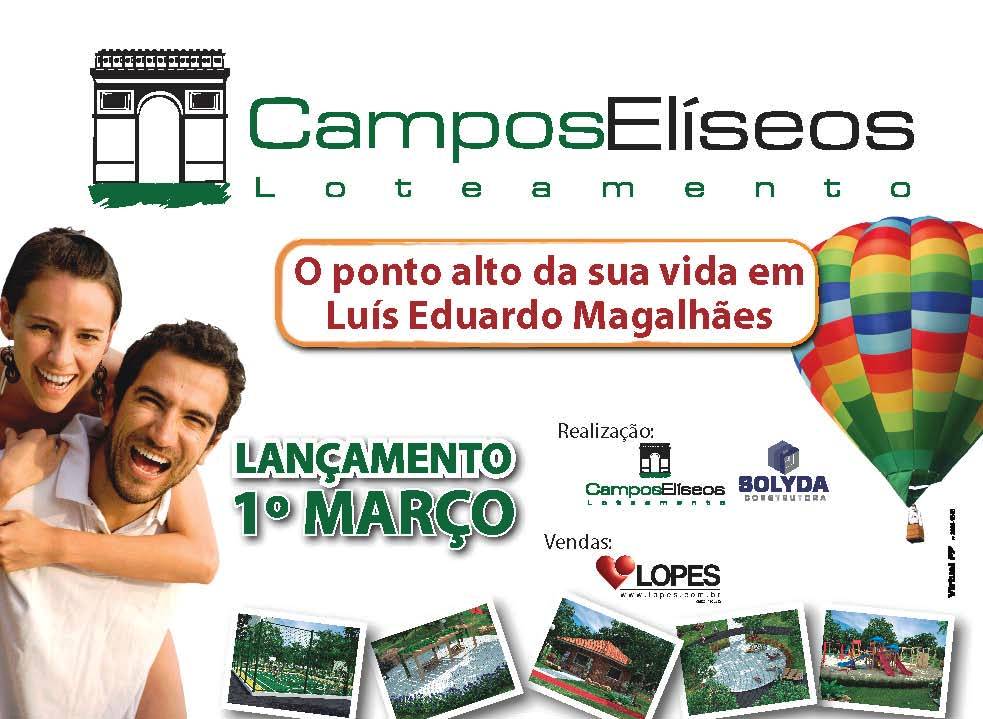 Novo loteamento em Luís Eduardo Magalhães Dia 1º, quinta-feira, às 14 horas, o lançamento do Loteamento Campos Elíseos no plantão de vendas da avenida Kichiro Murata, Jardim Imperial. -12.099405 -45.798260