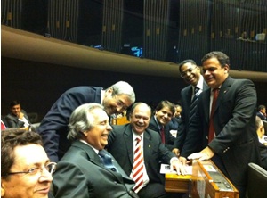 Na foto, obtida pelo deputado Félix Mendonça Jr., João Leão recebe os cumprimentos dos colegas de bancada pela nomeação, entre eles Geraldo Simões (PT-BA), Paulo Magalhães (DEM-BA), Luis Argolo (PP-BA), Márcio Marinho (PRB-BA), João Bacelar (PR-BA) e Antônio Imbassahy (PSDB-BA).