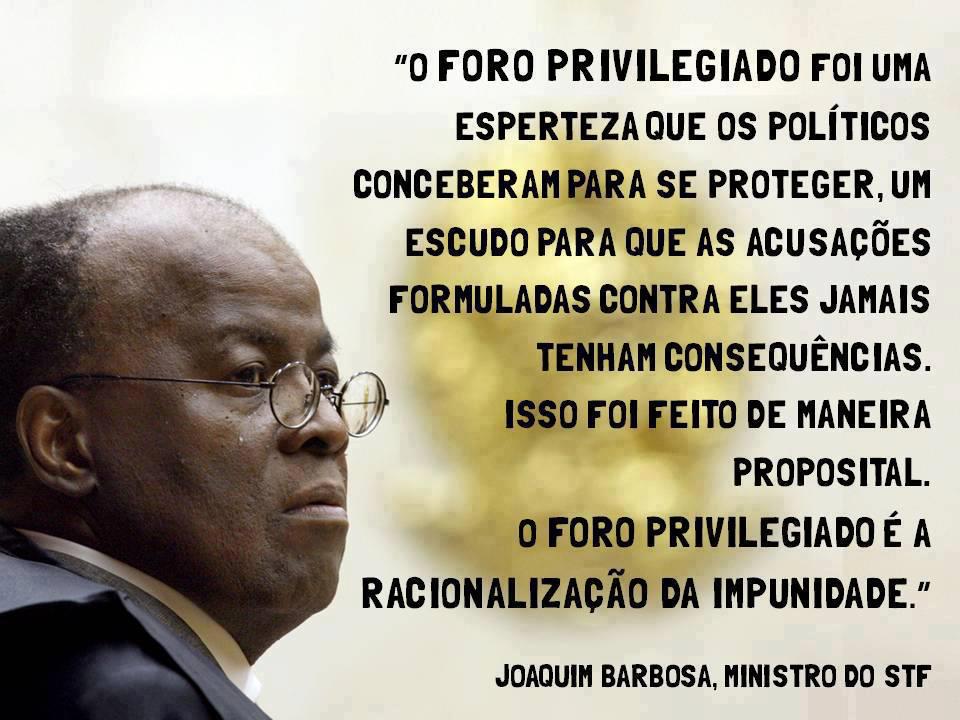 A frase é do presidente da Suprema Corte do País, Joaquim Barbosa. Queiram ou não aqueles que chamam a imprensa e as classes conservadoras de golpistas, a prisão de políticos de trânsito fácil no núcleo do poder não deixa de ser emblemática. Agora ficou mais fácil a presença, nas celas vip da Polícia Federal, dos propineiros dos trens de São Paulo e do GDF, dos mensaleiros do PSDB de Minas e dos prefeitos e vereadores envolvidos com a máfia do ISS da capital paulista. E por que não, um julgamento rápido para mais de 200 deputados e senadores que estão envolvidos com falcatruas de toda ordem e com processos em andamento no STF? E governadores e ex-governadores, deputados estaduais, prefeitos e vereadores que se locupletam do dinheiro do cidadão?