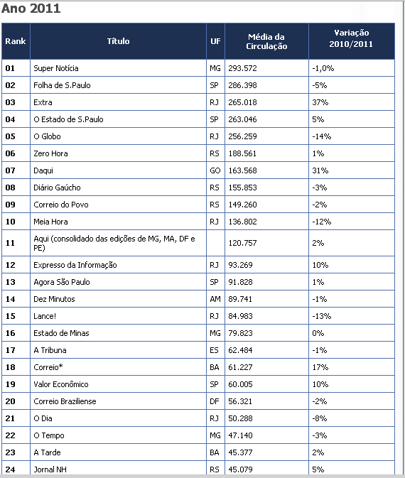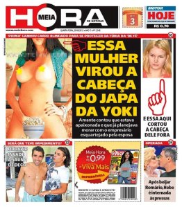 Os jornais populares estão tomando conta das notícias impressas no País. Jornais de tiragem gratuita, como o Metro, chegam a tiragens de 550 mil exemplares por dia, em edições em três capitais. O Super Notícia foi o jornal de maior circulação paga em 2011 e o Meia Hora já chegou a tiragens bem acima dos 200 mil exemplares. O apelo é mesmo bem popular como a capa estampada do Meia Hora (clique para ampliar). Estaremos tranquilos aqui no Oeste baiano enquanto não surgir o Siginews. Depois, vai ser o caos.