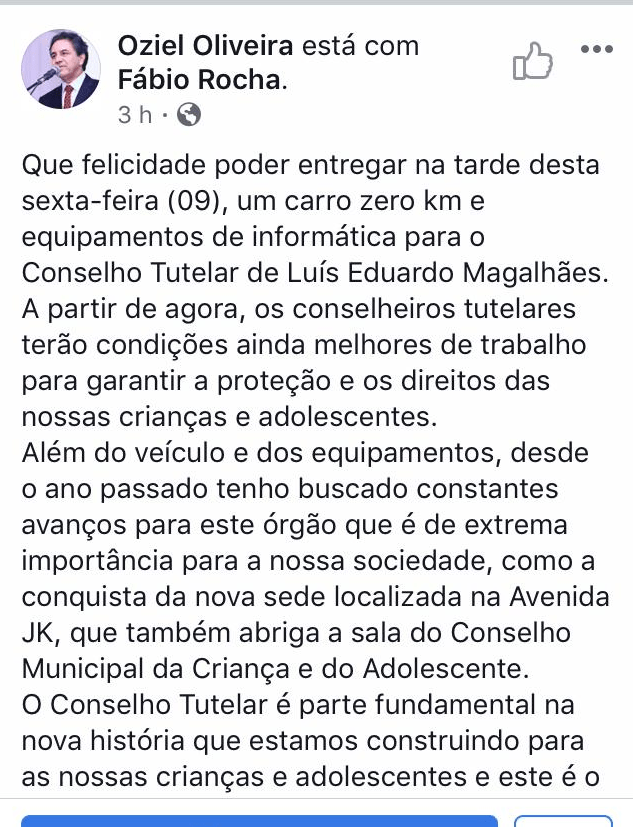 Na Capital do Agronegócio, o prefeito Oziel Oliveira recebeu, através da emenda do deputado federal Erivelton Santana (Patriotas), ainda antes das eleições, um kit completo para o Conselho Tutelar da cidade. O Deputado foi apoiado pela também candidata e ativista política, Juliana Carneiro.