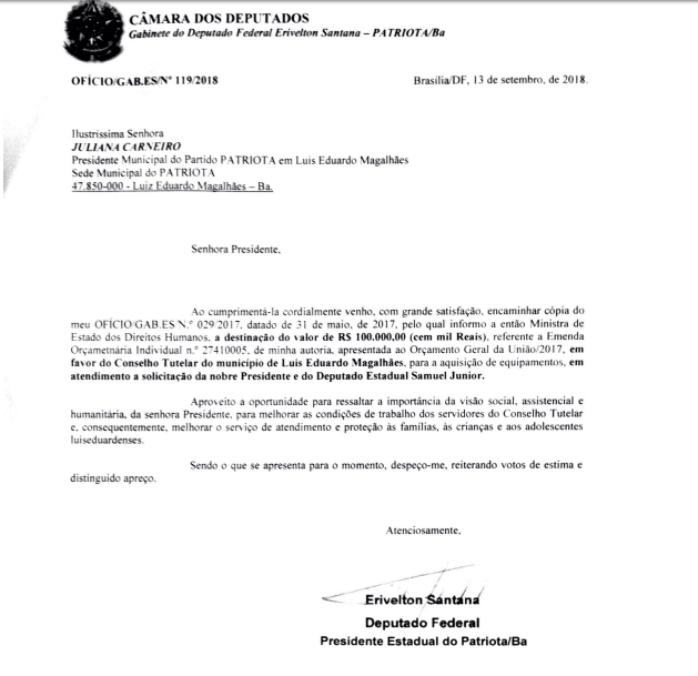Abaixo, o documento que comprova a destinação da verba de R$100 mil da emenda parlamentar do deputado Erivelton Santana.
