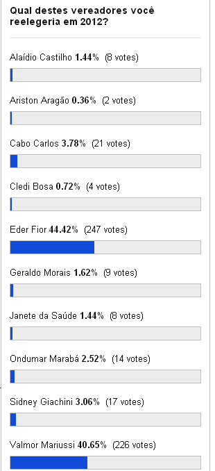 O importante é que ficamos conhecendo um pouco das preferências políticas de nossos leitores. Agora tenham certeza: nem de longe a enquete reflete os resultados futuros das urnas, em 2012, porque é praticamente impossível dois vereadores somarem mais de 80% dos votos. Nem a enquete influenciará os resultados futuros.